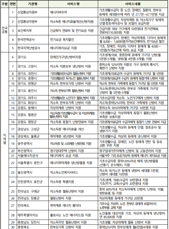 보조금24에서는 에너지바우처·저소득층 에너지효율개선(산업통상자원부), 긴급복지연료비 및 전기요금지원(보건복지부) 등 정부 및 지자체·공공기관 등이 제공하는 30여 개의 가스·전기·난방비 지원 서비스 대상을 확인 할 수 있습니다.