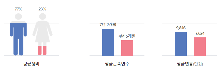 연령별 평균연봉은 전체 연령 중에서 가장 많이 받는 평균 연봉 구간은 5,000~7,000만 원으로 나타났고, 연도별 평균연봉은 동종업계 평균보다 37% 높다고 합니다. 성별 비율은 남성77%, 여성 23%라고 하고, 성별 연봉은 아래와 같습니다.