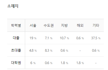 합격자 최종학력을 한번 보면, 대졸이 75%로 가장 많고, 서울 소재 대졸자들이 많았지만, 지방소재 대졸자들도 10%나 차지하고 있었습니다.