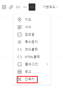 우선, 기본적인 단축키가 어디에 있는지 부터 한눈에 확인할 수 있는 위치는 글쓰기 탭을 누르고 우측상단에 있는 점세개를 누르면, 단축키 항목이 있습니다. 그곳을 클릭하면 어떤 단축키가 있는지 한눈에 볼 수 있는데, 다양한 단축기능이 있습니다. 이해하기 쉽게 종류별로 구분하여 다음 챕터에서 알려드리겠습니다.