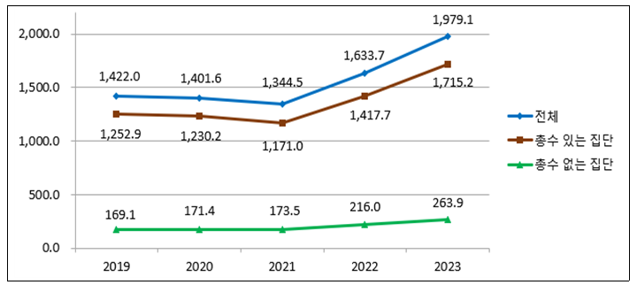 또한 자산총액 5조원 이상 기업집단의 자산총액은 꾸준히 증가하고 있고, 매출액은 21년 이후 상승추세에 있다고 합니다.