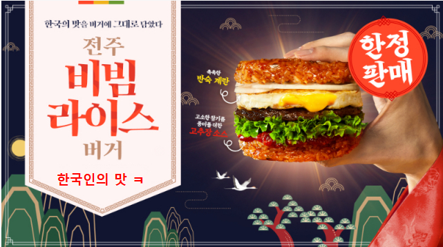 신제품 ‘전주비빔라이스’ 버거는 쌀로 만든 번의 중량을 과거 대비 약 160g 수준으로 늘렸으며, 비빔밥에 빠질 수 없는 반숙계란 패티와 소고기 패티로 구성하였으며, 고추장 소스를 활용해 비빔밥 맛을 구현했다고 하네요 ㅎㅎ