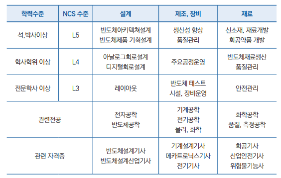 구성반도체 설계, 제조장비, 재료 분야를 기준으로 이에 필요한 업무와 관련전공, 역량, 관련 자격증은 다음과 같이 요약할 수 있다.